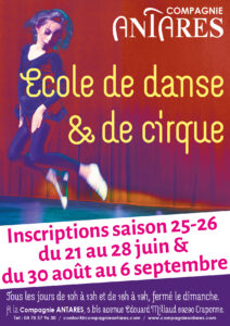 La Compagnie Antarès propose des stages cirque & danse contemporaine chaque vacances scolaires (hors vacances de Noël). Ils invitent les enfants à la découverte des Arts du cirque et de la danse contemporaine à travers la pratique mais aussi l’histoire de l’art de manière ludique et adaptée à chaque âge.